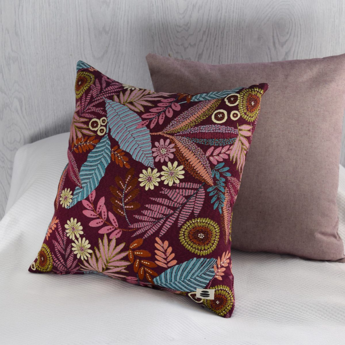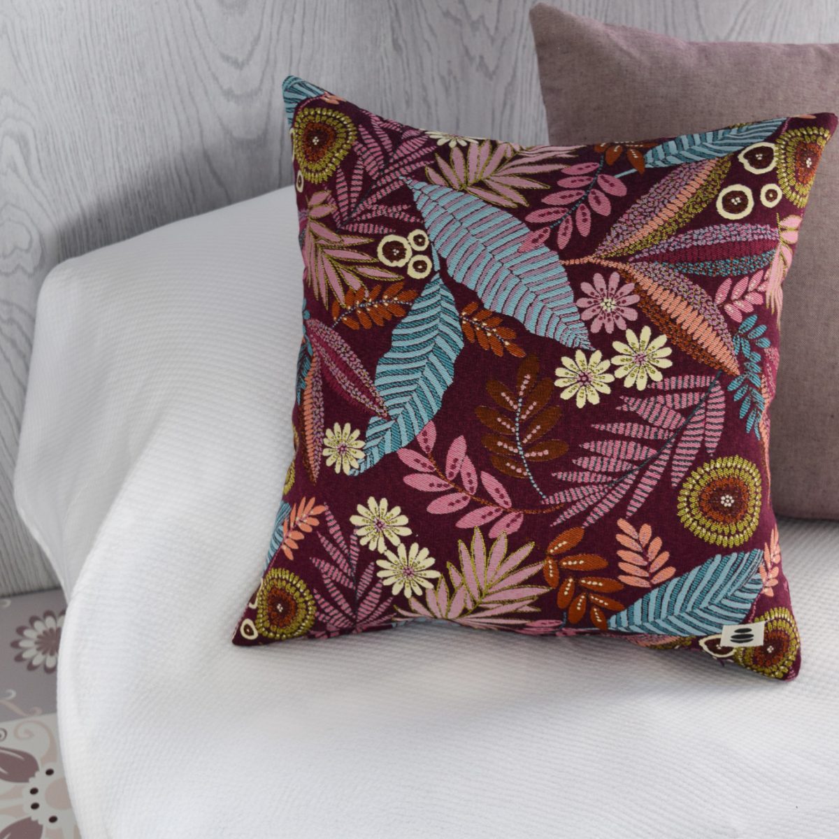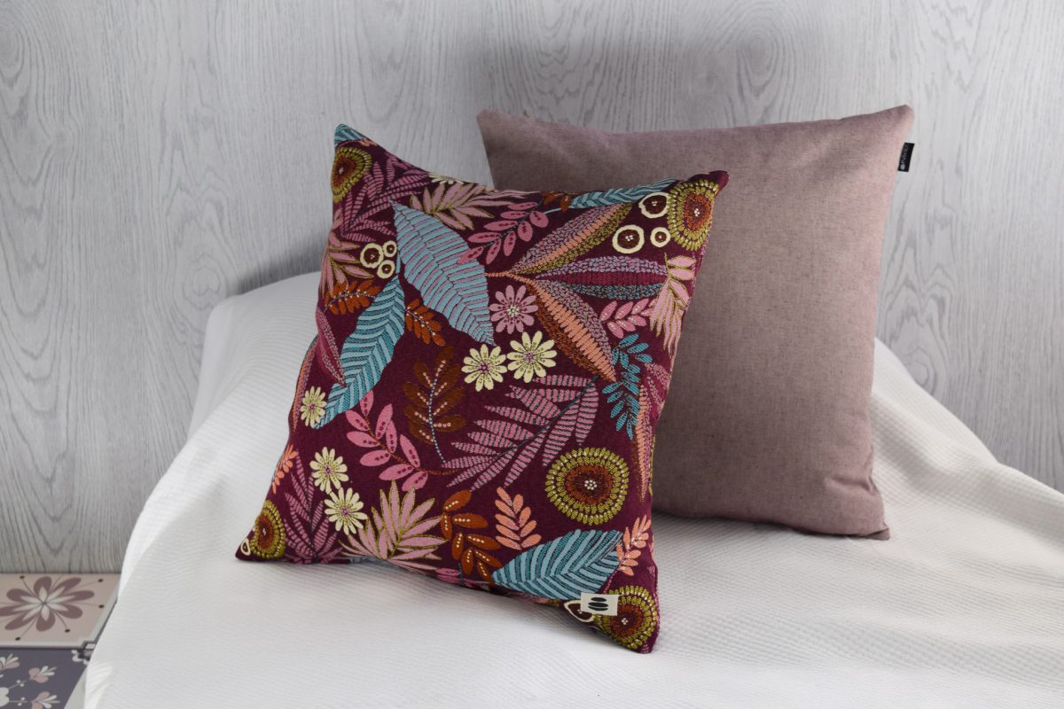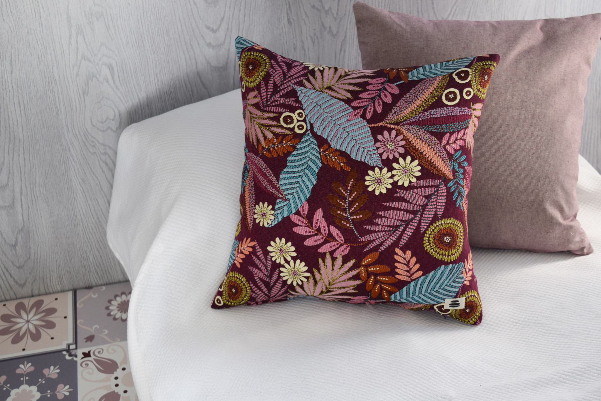 El diseño de la funda es detallado con un diseño floral y hojas en tonos vivos sobre fondo morado. Ideal para espacios con un estilo único. Esta combinación de colores y formas crea un efecto visual atractivo y sofisticado, ideal para dar vida a sofás, sillones o camas. No es una funda básica: es una pieza decorativa que puede transformar por completo cualquier espacio.